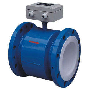 污水流量计测量原理是基于法拉第电磁感应定律。流量计的测量管是一内衬绝缘材料的非导磁合金短管。两只电极沿管径方向穿通管壁固定在测量管上。其电极头与衬里内表面基本齐平。励磁线圈由双方波脉冲励磁时,将在与测量管轴线垂直的方向上产生一磁通量密度为B的工作磁场。此时,如果具有一定电导率的流体流经测量管。将切割磁力线感应出电动势E。电动势E正比于磁通量密度B,测量管内径d与平均流速v的乘积。电动势E(流量信号)由电极检出并通过电缆送至转换器。转化器将流量信号放大处理后,可显示流体流量,并能输出脉冲,模拟电流等信号,用于流量的控制和调节。